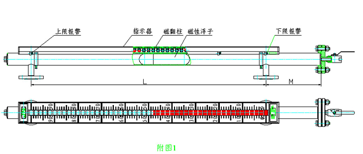 結(jié)構(gòu)原理 液位計(jì)根據(jù)浮子原理和磁性耦合作用研制而成。當(dāng)被測(cè)容器中的液位升降時(shí),液位計(jì)主導(dǎo)管中的浮子也隨之升降,浮子內(nèi)的永久磁鋼通過磁耦合傳遞到現(xiàn)場(chǎng)指示器,驅(qū)動(dòng)紅、白翻柱翻轉(zhuǎn) 180 °,當(dāng)液位上升時(shí),翻柱由白色轉(zhuǎn)為紅色,當(dāng)液位下降時(shí),翻柱由紅色轉(zhuǎn)為白色,指示器的紅、白界位處為容器內(nèi)介質(zhì)液位的實(shí)際調(diào)高度,從而實(shí)現(xiàn)液位的指示。
